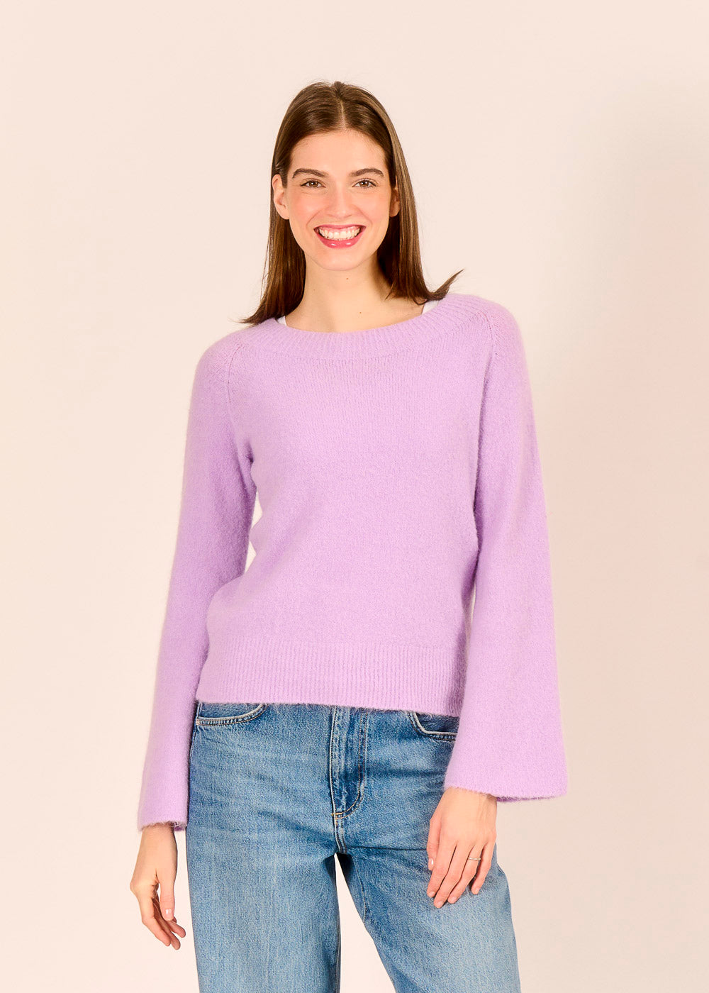 Der weiche, lilafarbene Strickpullover umhüllt und wärmt dich dank des Anteils an Baby Alpakawolle. Sein Carmenausschnitt sowie die ausgestellten Arme verleihen dem lässigen Design eine besondere Raffinesse. Der frische Farbton lässt sich besonders schön mit Denim oder hellem Cord kombinieren.