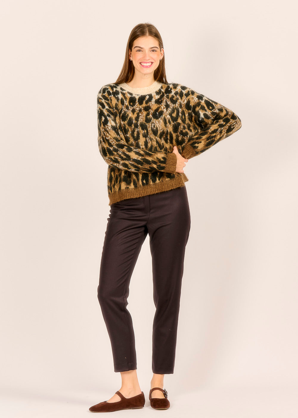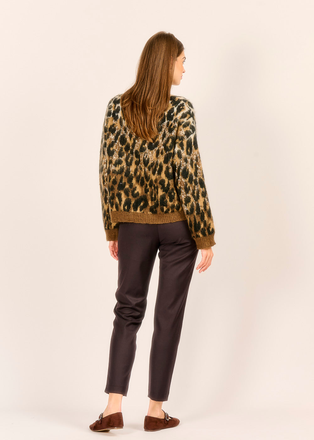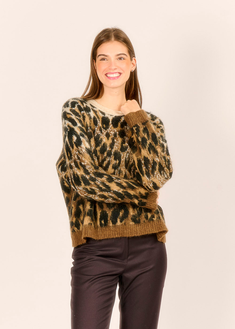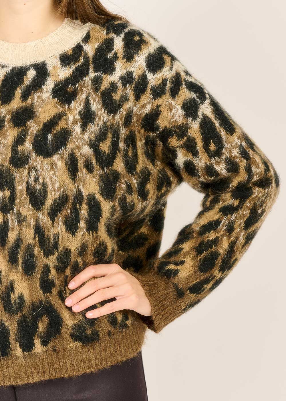 Tauchen Sie ein in den urbanen Dschungel mit diesem unwiderstehlichen Animal-Print-Pullover, der sofort alle Blicke auf sich zieht. Das flauschige, luxuriöse Material und der trendige Leoparden-Look in warmen Braun- und Schwarztönen garantieren einen stilvollen und zugleich gemütlichen Auftritt. Kombinieren Sie ihn mit einer schlichten Hose oder Jeans, um den mutigen Print in den Mittelpunkt zu stellen und Ihr Outfit zu einem echten Statement zu machen.