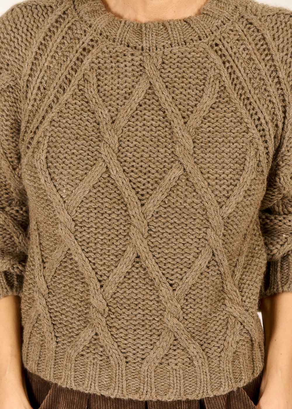 Dieser herrliche Pullover in einem warmen, eleganten Kakao-Ton umhüllt Sie mit einer rustikalen Gemütlichkeit, perfekt für kühle Tage. Das Zopfmuster zieht sich all over über das gesamte Modell, nicht nur vorne, und verleiht dem Strickstück eine beeindruckende Textur und hochwertige Tiefe. Kombinieren Sie diesen luxuriösen Pullover mit Röcken oder Hosen für einen stilvollen Look, der traditionelle Handwerkskunst und modernen Komfort vereint.