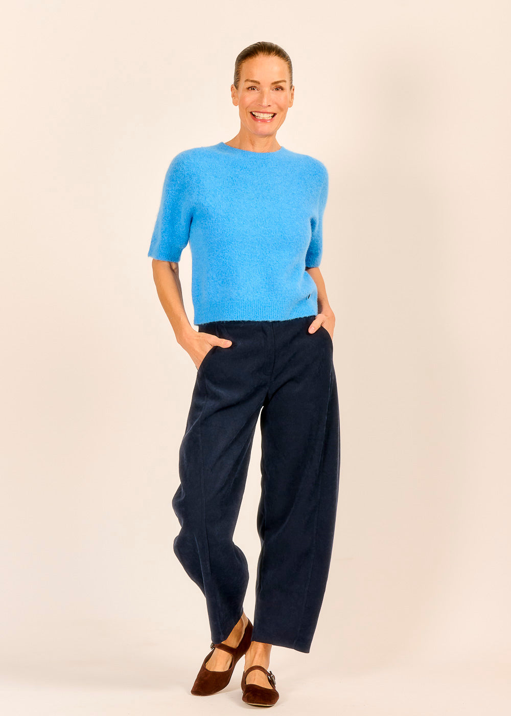 Der Halbarm Strickpullover mit feinster Baby Alpakawolle strahlt wie der Himmel über der Toskana und bringt Frische in deinen Look. Kombiniert mit einer Ballon-Pantalone wirkt der moderne Schnitt besonders edel.